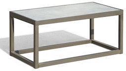 Perfect sleek coffee table for lots of different collections. Frame is made from powder-coated aluminum and the top is a porcelain one-piece tile. Dark pewter frame color with light gray tile color.