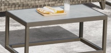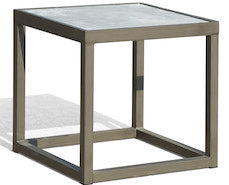 Perfect sleek square end table for lots of different furniture collections. Frame is made from powder-coated aluminum and the top is a porcelain one-piece tile. Dark pewter frame color with light gray tile color.