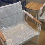 CLOSEOUT LAST SET: Sofa, 2-Club Chairs, Coffee, 2-End Tables. Coast is a perfect deep seating sling outdoor set with padded sling for comfort. Arm caps and table tops are teak on a powder coated white aluminum frame.