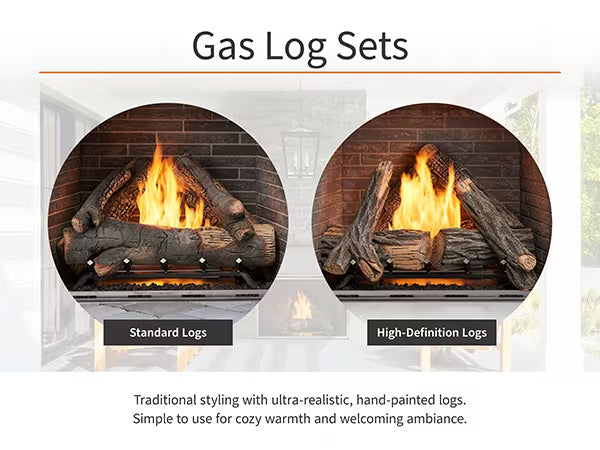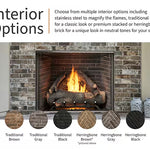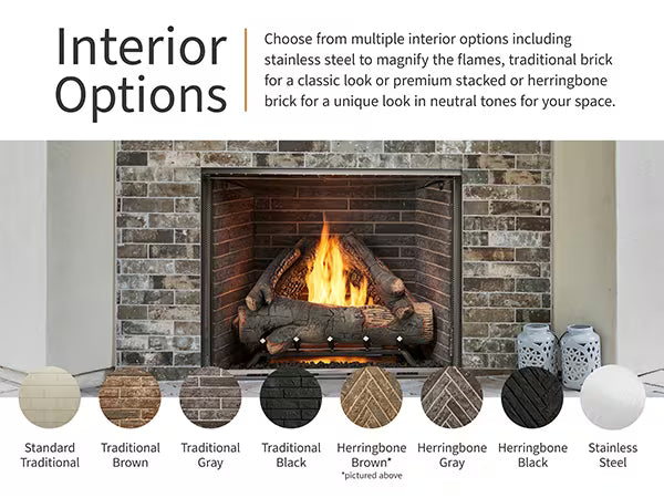 Fireplace includes either traditional white brick or herringbone panel inside (your choice) as well as Electronic IPI valve ignition and choice of log style. Upgrade inside color panels available at additional cost.