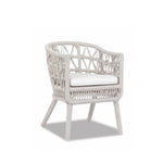 The Dana Dining Chair is the perfect balance of intricate pattern combined with an organic, free flowing aluminum structure. The macramé inspired bucket frame features a curved back and sloped arm, expertly wrapped in premium all-weather olefin rope in natural Linen.
