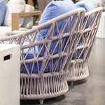 The Dana Club Chair is the perfect balance of intricate pattern combined with an organic, free flowing aluminum structure. This macramé inspired frame features a curved back and sloped arm, expertly wrapped in premium all-weather olefin rope in natural Linen. Canvas Flax is stock Sunbrella fabric