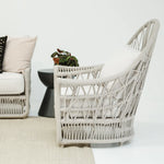 The Dana Wing Chair is the perfect balance of intricate pattern combined with an organic, free flowing aluminum structure. The dramatic frame features a high back and rolled arm, expertly wrapped in premium all-weather olefin rope in natural Linen.