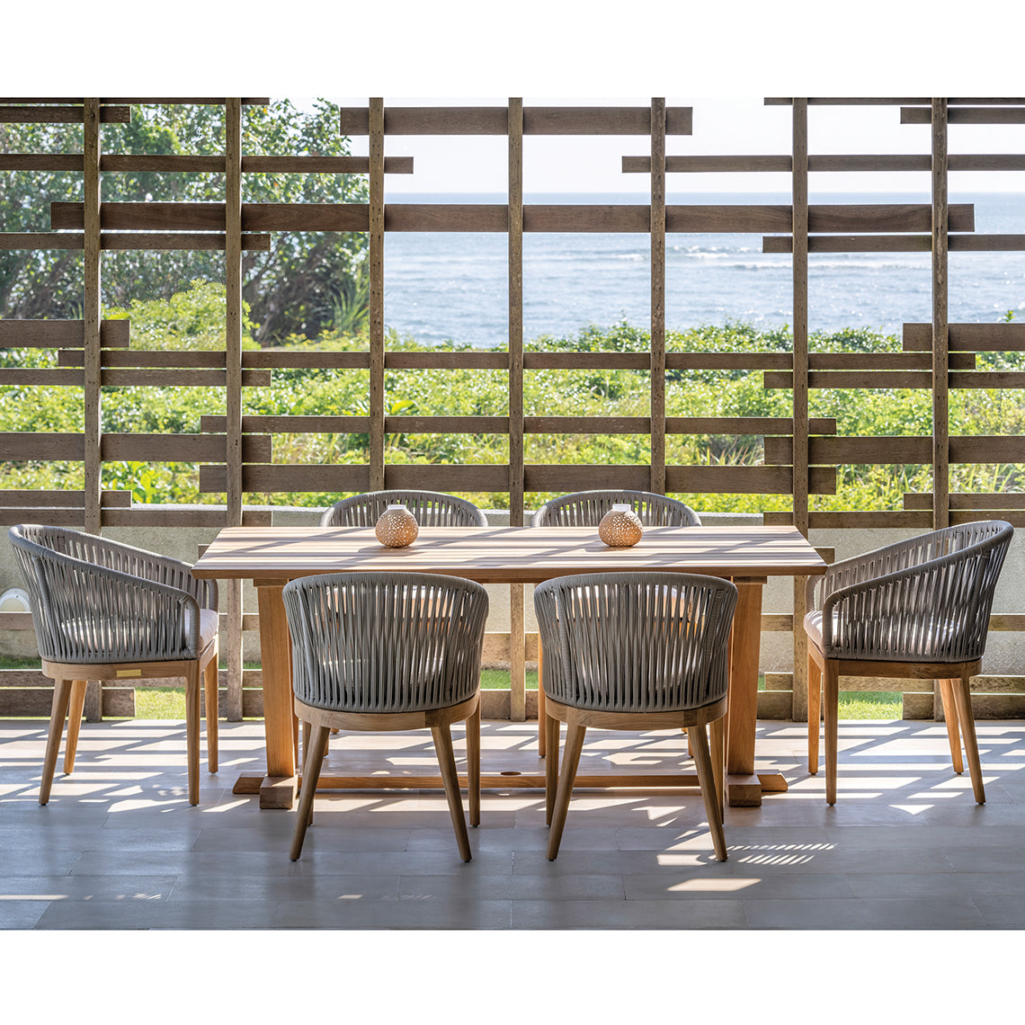 The slender and airy Lucia collection has a relaxed style that complements modern and traditional settings. Gracefully curved aluminum backrests are wrapped with weather friendly rope in an open, vertical pattern. Beautifully sculpted bases are crafted from premium teak. Sling decking beneath the seat cushions offers just the right amount of spring.