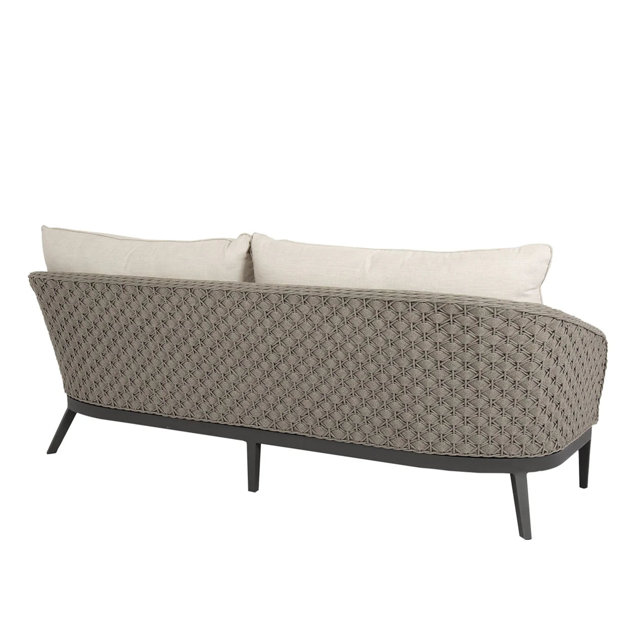 The Marbella Sofa offers a mid-century style frame with curved back and sloping arms, with tapered legs in Graphite powder-coated aluminum. Plush 6" cushions and pillow back offer ultimate comfort. STOCK FABRIC is Sunbrella Echo Ash.