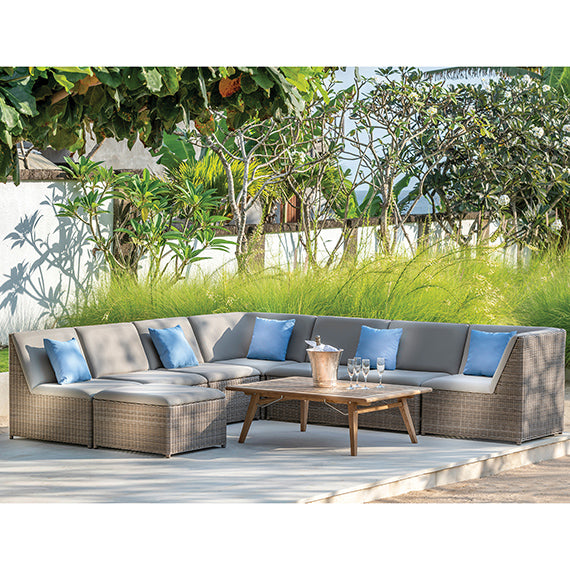 As shown: L shape (2-Corners 5-Armless, 1-Ottoman)