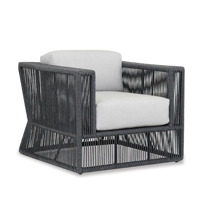 The Milano Club Chair provides clean lines and thoughtful angles with a hand-woven rope design. Its curved powder coated aluminum frame is expertly wrapped with premium all-weather olefin rope in a slate finish, and features and features a box frame with pinched back leg detail. Echo Ash Sunbrella