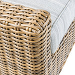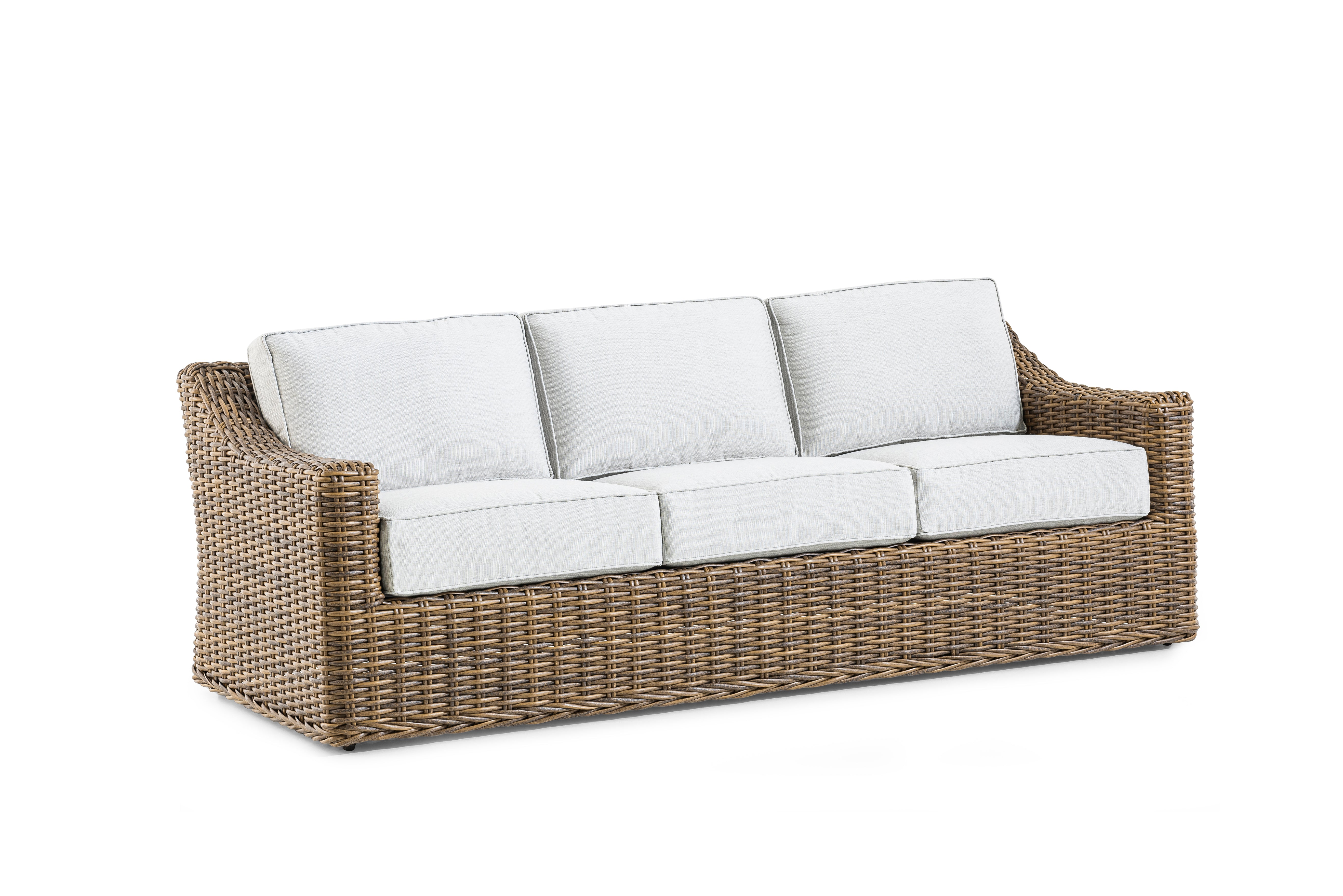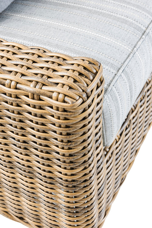Our Miramar all-weather wicker furnishings are crafted from premium quality HDPE (high-density polyethylene) resin, which is handwoven over reinforced rustproof aluminum frames. Lab tested for fade-, sag- and mildew resistance, our all- weather wicker is virtually maintenance free. To extend the life of your furniture, consider using protective covers to keep dirt, debris, and UV Sunlight off the furniture in off-season. STOCK COLOR: Carmel Woven, Echo Ash Sunbrella
