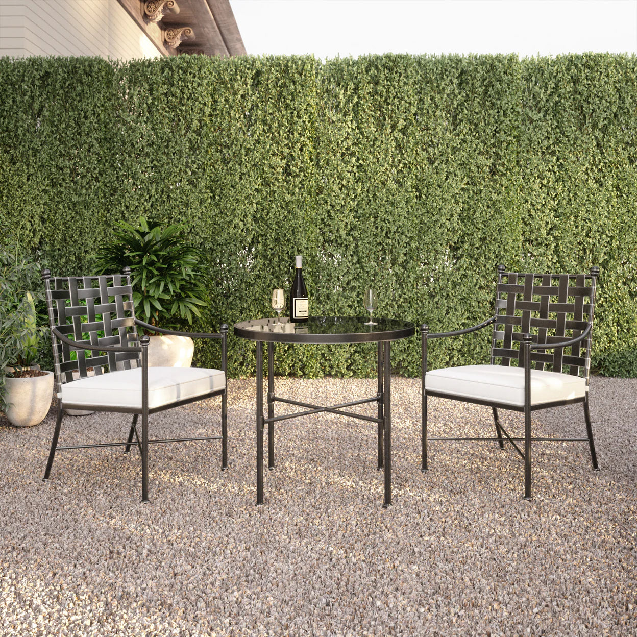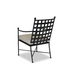 Constructed in expertly crafted wrought iron, the Provence Dining Chair displays a woven back to emulate basket weave, and subtly brushed Century Pewter antique finish. Gently bowed arms and generous seat are scaled for absolute comfort. Canvas Flax Fabric