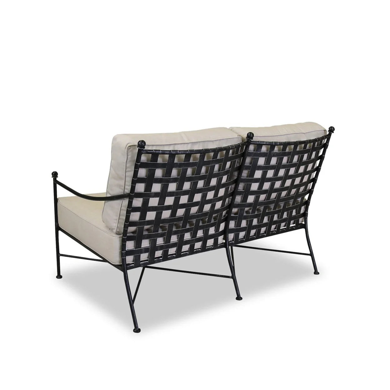 Constructed in expertly crafted wrought iron, the Provence Loveseat displays a woven back to emulate basket weave, and subtly brushed Century Pewter antique finish. Gently bowed arms and generous seat are scaled for absolute comfort.Dimensions: