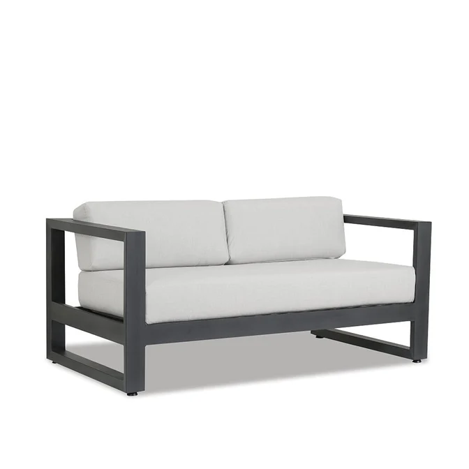 The Redondo Loveseat blends modern and industrial sensibility into one striking design. Informed by mid-century design elements, the Redondo features a low back and smart, linear frame. Crafted in powder coated aluminum in a hand-brushed Slate finish. Stock fabric is Sunbrella Cast Silver.