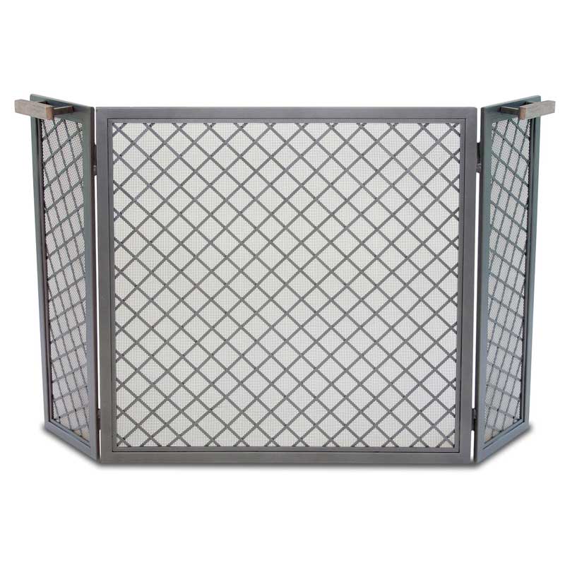 Stanton Tri-Panel folding fireplace screen. All metal construction with natural weathered wood handle accents and smooth bullet hinges. This Stanton screen is designed to fit most fireplaces. Warm up the look and feel of your fireplace with this handsome décor upgrade.