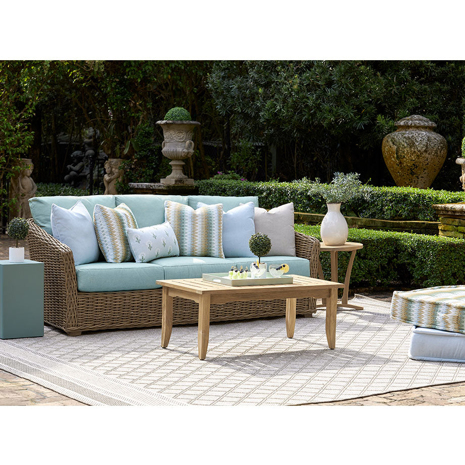 The Tamandayu collection has a relaxed, artisanal charm with durable and stylish features. The seating pieces have a slightly curved shape and a robust, chunky, loose weave in a warm Barley color. The occasional tables are made from durable Resysta in a rich Java finish, designed to look like wood.