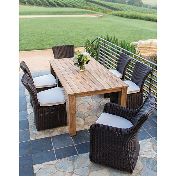 Tuscany tables and benches are made from solid, distressed teak wood. Knots, checking, and other imperfections give each piece its own unique character – no two items are exactly alike. Tables can be ordered in Rustic Finish.